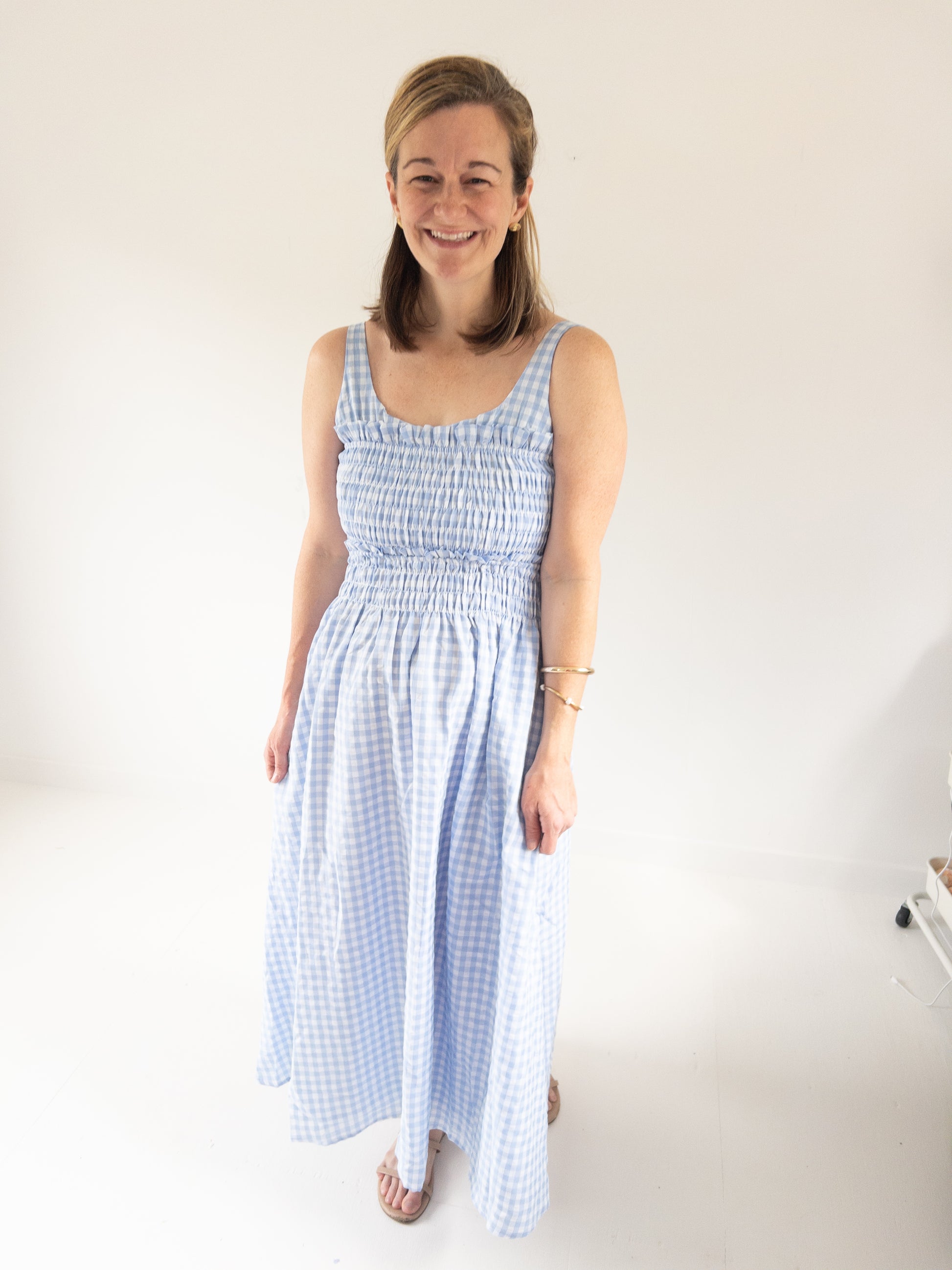 Our blue gingham midi is the kind of dress that never goes out of style. Featuring a flattering smocked bodice, adjustable straps, and the best little detail — pockets — it’s as functional as it is feminine. Fully lined and easy to wear, this one is perfect for everything from church to spring events.
