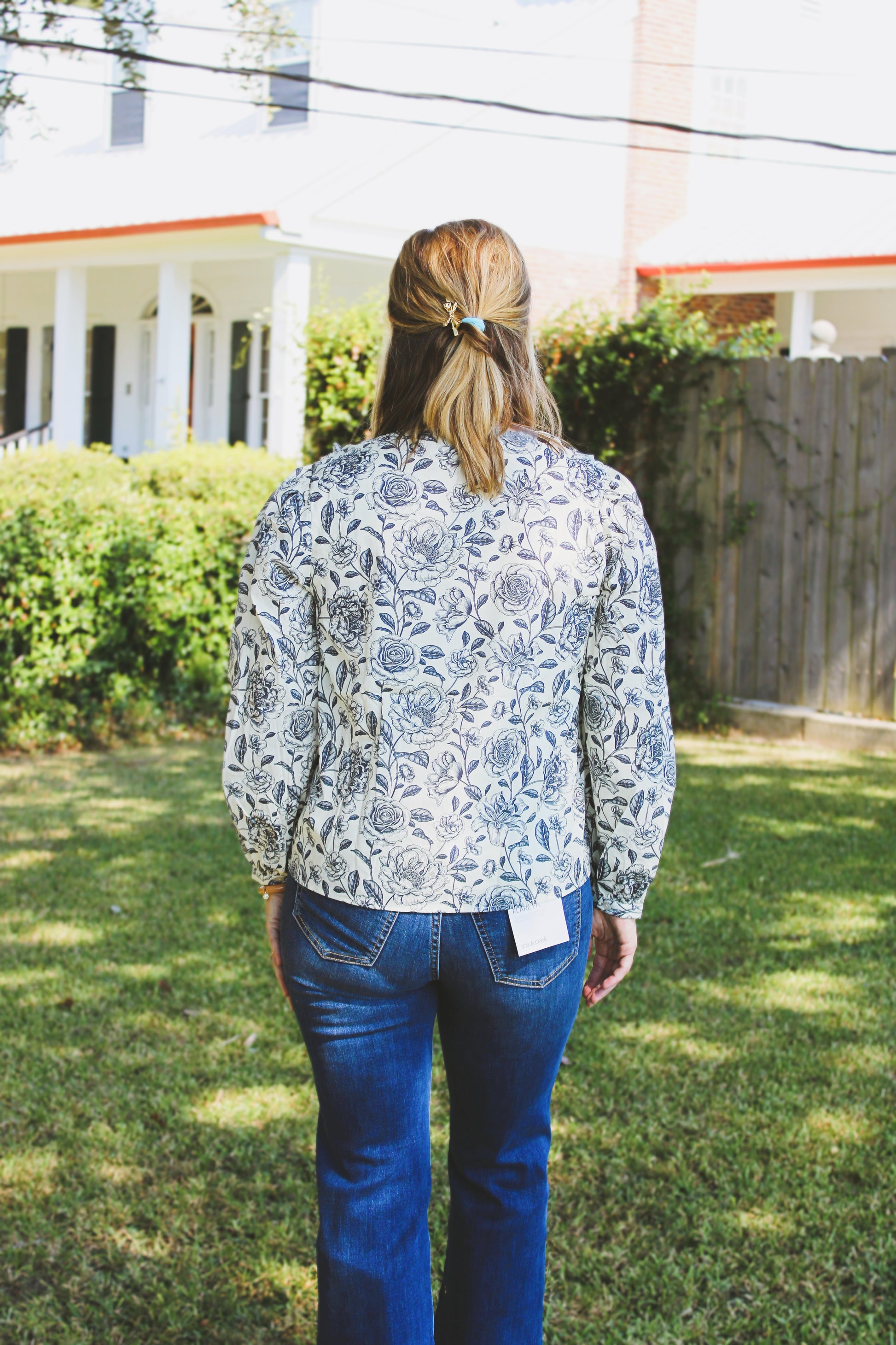 This navy floral and ivory blouse is the perfect mix of classic and fun. Featuring functional buttons and a breathable fabric, it’s as comfortable as it is stylish. The eye-catching print makes it a standout piece, while its versatility shines when paired with denim and boots for the perfect fall look.