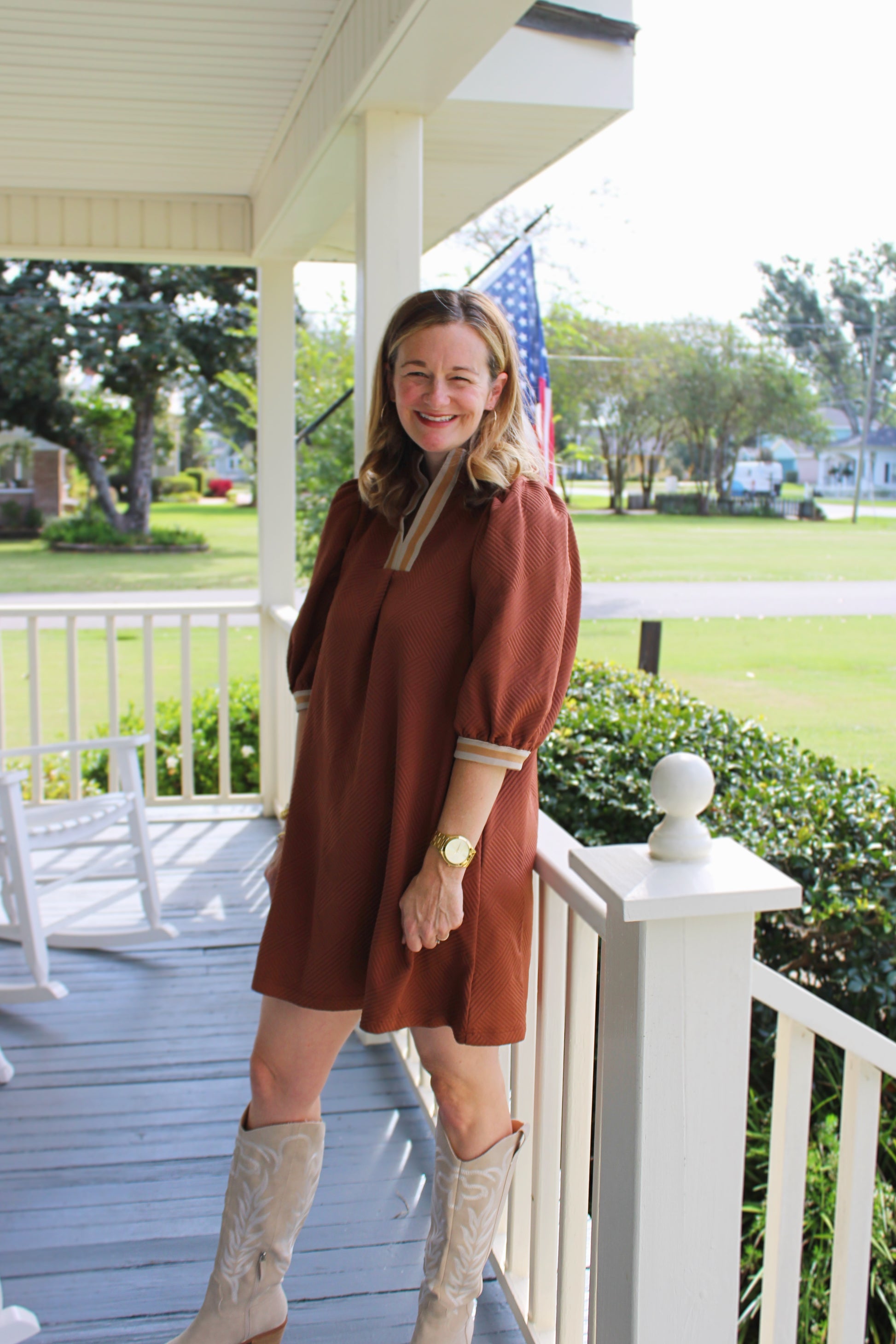 Textured brown mini dress featuring subtle stripe detailing at the neckline and sleeve cuffs. The loose, comfortable fit makes it easy to wear and style — perfect for casual days, church, or a nice dinner out. A simple yet chic piece you’ll reach for all season long.
