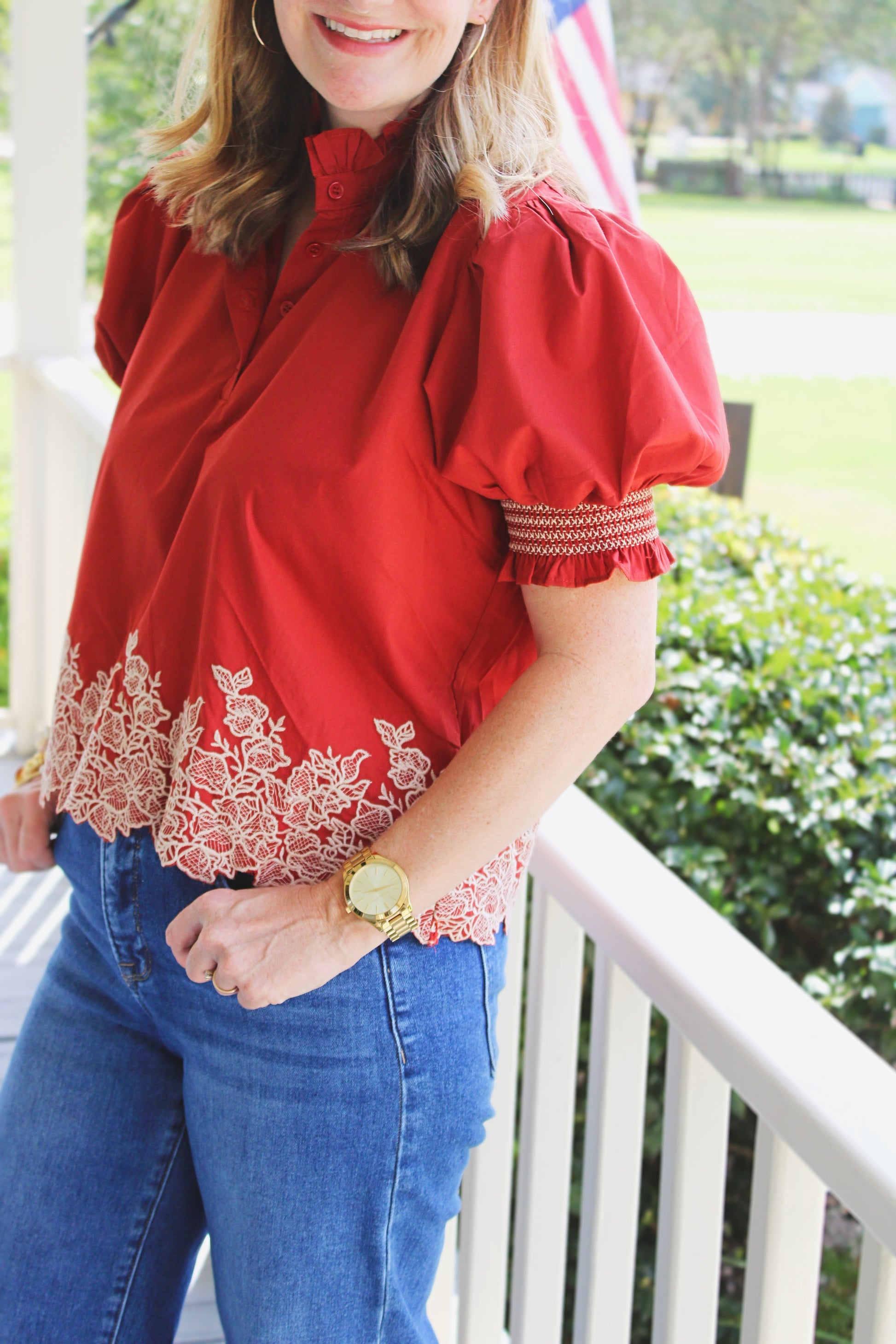 Brick orange blouse with beautiful ivory floral embroidery along the hem for a feminine touch. Designed with functional buttons down the front and cinched smocking at the sleeves for a slight puff effect. A flattering, easy-to-style top that pairs perfectly with denim or skirts for a polished fall look.
