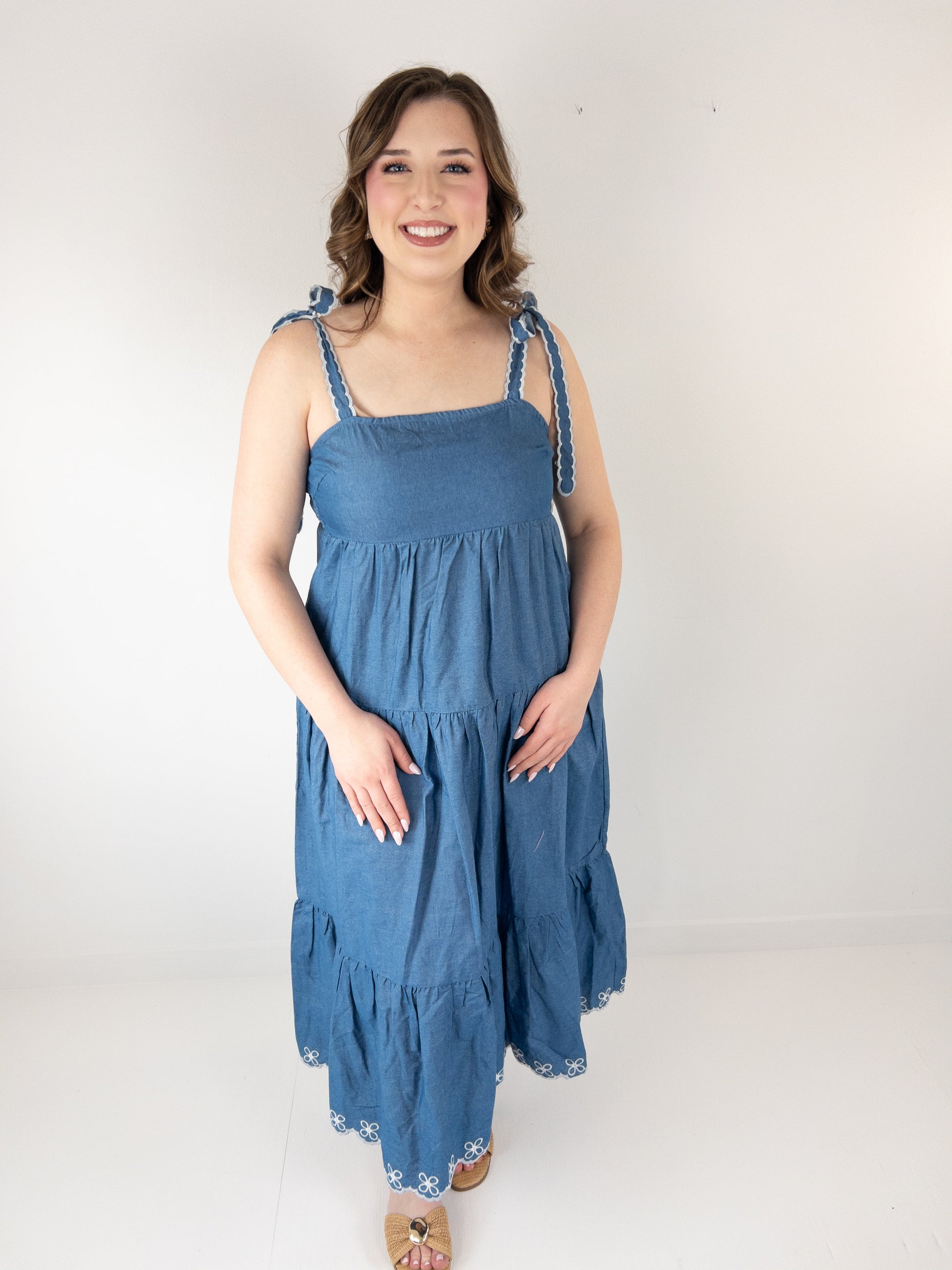 This lightweight denim dress is the perfect mix of sweet and timeless. Designed with adjustable tie straps for the perfect fit, it features delicate embroidered accents and scalloped detailing that elevate the entire look. The soft, breathable denim keeps it comfortable while still feeling polished.